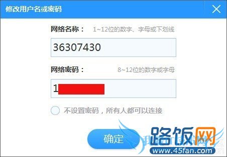 2、创建网络过程大约20秒左右就会弹出随机网络名称和密码框,如下图所示: