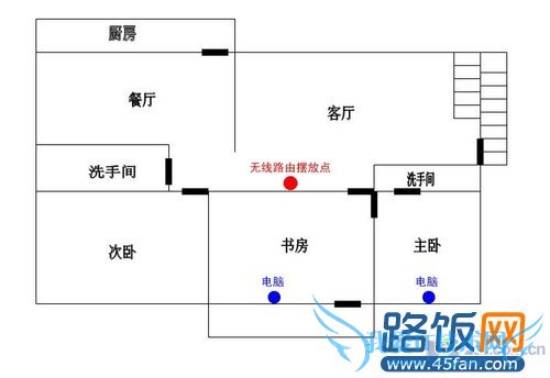 如图所示,书房外墙处是摆放无线路由器的理想位置,这样摆放能够使客厅,书房,主卧,次卧都有一个比较好无线信号。当然,不同家庭结构都不一样,大家应该视具体情况而定。一般来说,无线网卡的客户端都具备信号强度的检测能力,大家拿笔记本在房间各处查看信号强度,从而选择一个最佳的摆放点。另外也可以安装Network Stumbler软件来检测信号的强度。