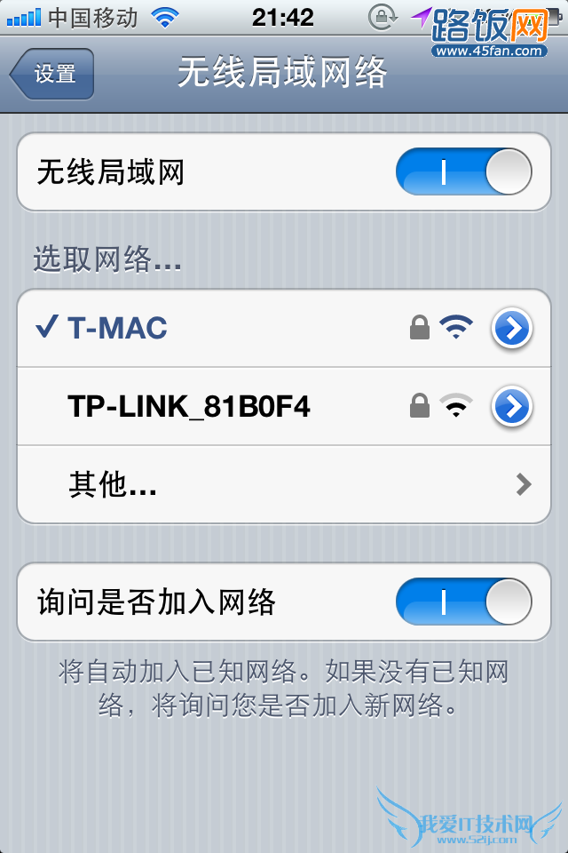 以笔者的iPhone4S手机为例,进入设置界面》无线局域网,如下图,无线SSID号T-MAC,点进去。