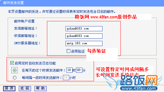 4、进入“邮件发送设置”界面下,输入发送邮箱地址、接收邮箱地址和SMTP服务器地址并勾选启用验证,如果需要定时发送系统日志,还可以根据特定时间或者间隔一段时间,如24或48小时发送一次,则勾选启用定时自动发送日志功能。如下图所示:
