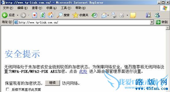 路由器无线安全设置为非WPA-PSK/WPA2-PSK AES加密情况下,打开网页时会弹出如上提示。