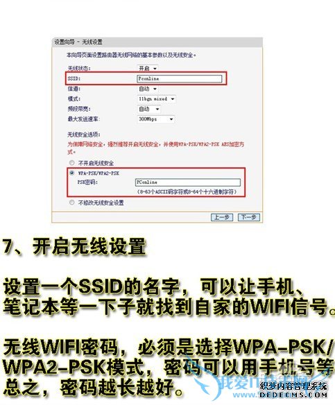 接下来进入无线设置,设置SSID名称,这一项默认为路由器的型号,这只是在搜索的时候显示的设备名称,可以根据你自己的喜好更改,方便搜索使用。其余设置选项可以根据系统默认,无需更改,但是在网络安全设置项必须设置密码,防止被蹭网。设置完成点击下一步。
