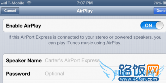 如果用户的无线基站是较新的AirPort Express,则借助其配备的音频输出端子外接音箱,使用iOS设备的AirPlay功能无线播放音乐。所有的相关设置,都在“AirPlay”选项部分完成。
