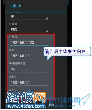4、设置相应正确的IP地址,点击保存即可。如下所示:IP地址:192.168.1.123,网关192.168.1.1,网关24代表255.255.255.0