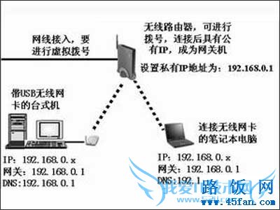 使用上面的拓扑架构时,AP和无线路由的用法是一样的。不过,大部分无线路由器由于具有宽带拨号的能力,因此可以直接跟ADSL MODEM连接进行宽带共享:
