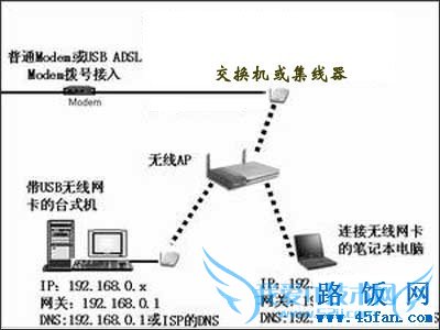 AP不能直接跟ADSL MODEM相连,所以在使用时必须再添加一台交换机或者集线器: