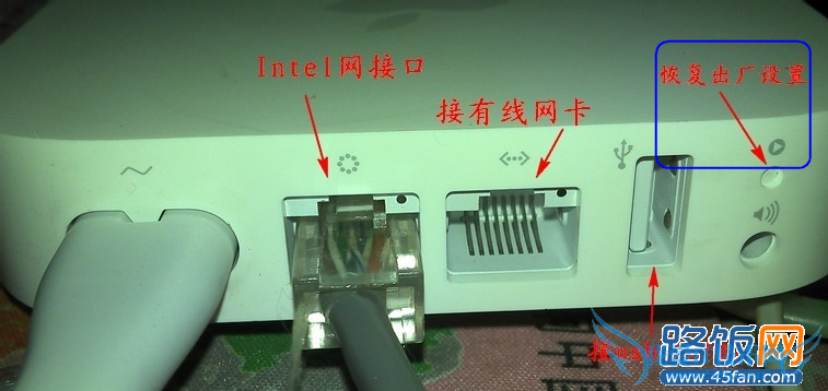 2、使用网线一端连接到苹果路由器网口上,另一端连接到ADSL口上,然后接通电源并使用回形针顶住“恢复出厂设置”按钮直至黄灯急闪。如下图所示: