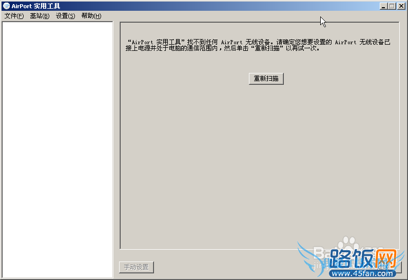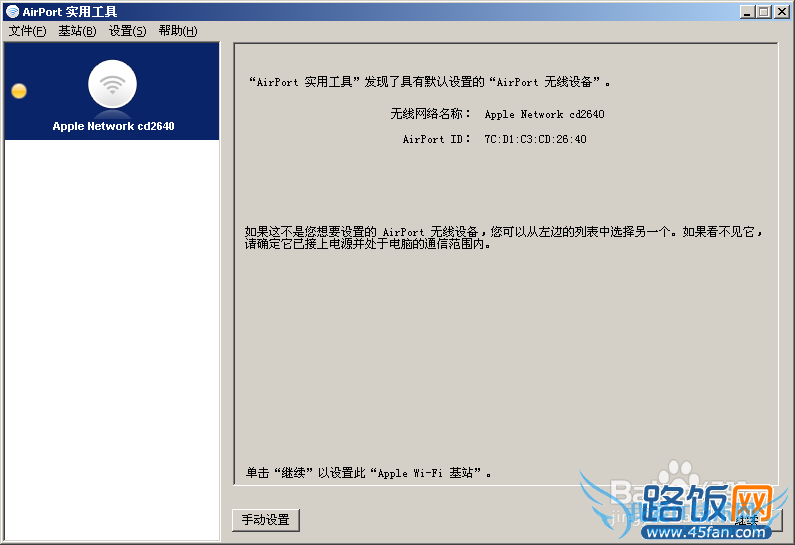 3、运行苹果路由器专用设置软件Airport,软件会自动扫描并显示Apple Network xxxxx无线路由器信号。如下图所示: