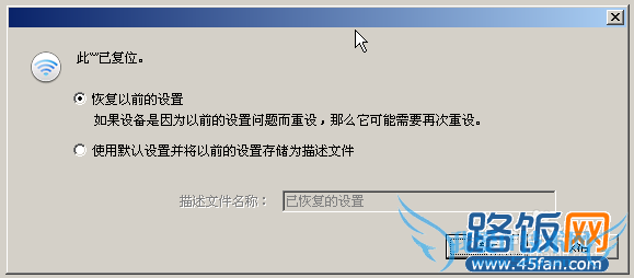 6、点确定后,会弹出一对话框,选择第1项“恢复以前的设置”,点确认。如下图所示: