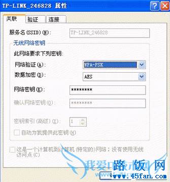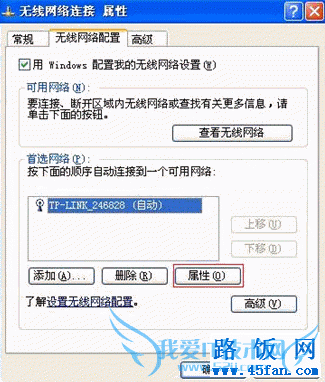 4)选择可用网络的属性,在无线网络密钥中核对网络验证是否与路由器中加密方式一致。如果不一致,请先修改验证