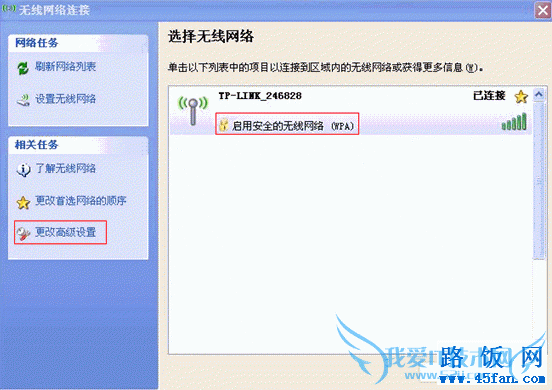 2)在无线网络连接中查看无线网络,观察搜索到的无线网络是否进行了加密设置。下图为一个WPA加密的无线网络