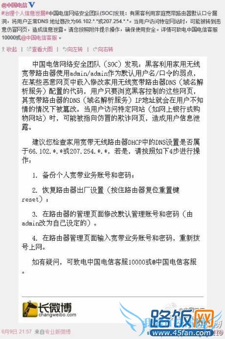 今天,中国电信网络安全团队发布消息称有黑客利用宽带路由器默认用户名和密码漏洞,将用户正常上网DNS篡改为以66.102.*.*开头或207.254.*.*开头的地址。当用户在不知情的情况下,使用这类DNS地址访问网页,会被转到黑客事先制作好的恶意网站上去,从而造成用户信息泄露。