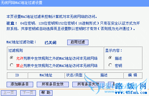 通过有线登陆路由器管理界面,“无线参数(无线设置)”-“MAC地址过滤”,确认其为关闭状态。