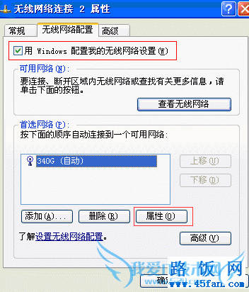 3. 在“无线网络配置”中选择所要连接的网络,点击“属性”。