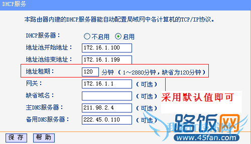 4、设置地址租期,最大值是2880分钟,最小值为1分钟,无线路由器默认缺省值是120分钟,以缺省值为例,如下图所示:
