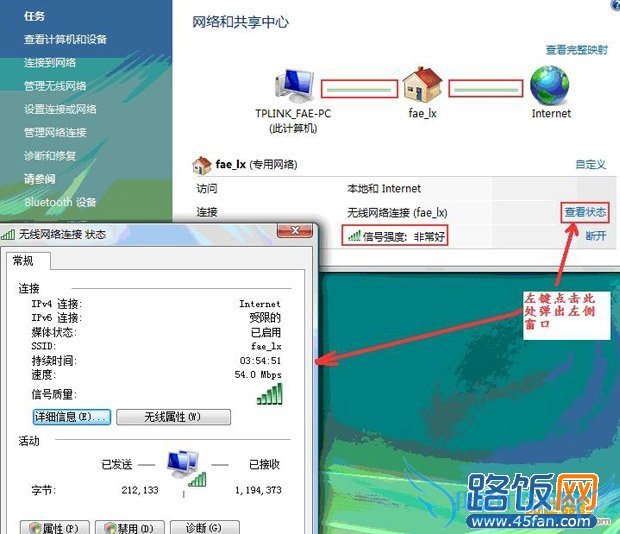 在网络和共享中心中我们可以查看无线网卡和无线AP的连接情况以及AP与Internet的连接情况。如下图所示: