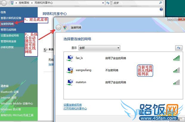 首先、打开“网络和共享中心”,双击左侧的“连接到网络”菜单,此时系统会弹出当前可用的无线网络。如下图所示: pdfgoword.com