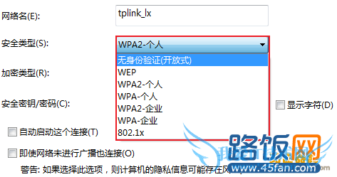 在上述配置界面中会提示我们输入无线信号的一些参数,比如在路由器上设置的网络名(SSID号)、加密类型等等。其中支持的加密类型有以下几种: