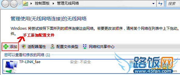 在上述配置界面中我们可以看到已经有了一个无线网卡的配置文件,这是由于之前此电脑曾经接入过无线网络,系统会为无线网卡自动保存一个配置文件。双击“TP-LINK_fae”可以查看此配置文件的详细信息。当然您也可以手动添加一个无线网卡配置文件。如下图所示: