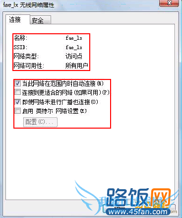 在上述配置界面中我们可以看到已经有了一个无线网卡的配置文件,这是由于之前此电脑曾经接入过无线网络,系统会为无线网卡自动保存一个配置文件。双击“TP-LINK_fae”可以查看此配置文件的详细信息。当然您也可以手动添加一个无线网卡配置文件。如下图所示: