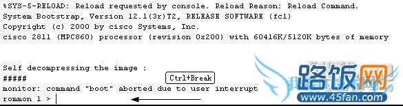 如果我们把密码丢了,那么我们就需要从ROM中来获取OS映像(配置寄存器值为:0X2142)。在路由器加电自检过程中使用组合键:Ctrl+Break进入Rommon>状态: