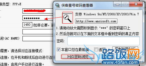 此时的口令上密码为“*”号,我们只能通过软件和识别这个密码了,可以下载一个:侠客密码查看器,具体方法见:忘记adsl密码该怎么办
