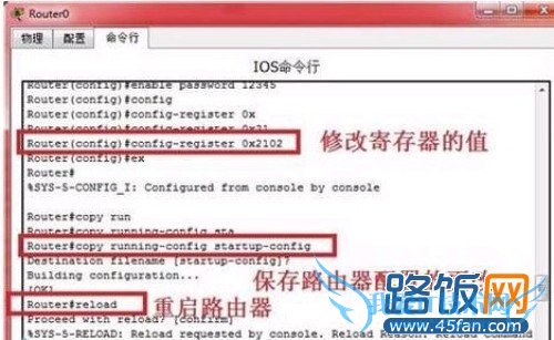 接着输入命令改变配置寄存器的值为 0x2142,然后再次的重新启动路由器。