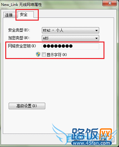 选择“安全”页,能够看到“网络安全密钥”这一栏的密码是隐藏的,这个密码就是我们要找的访问无线连接的密码。主要选中密码下方的“显示字符”,“网络安全密钥”中将以明文的形式显示密码。这样我们就能获得无线连接密码了。