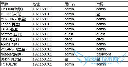 这里列举一些常见品牌的无线路由器默认管理地址、用户名以及密码,供需要的朋友们作为产考用,还有就是各品牌的配置在无线路由器设置大全http://www.45fan.com/a/password/1469.html,相信会帮到大家: