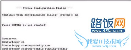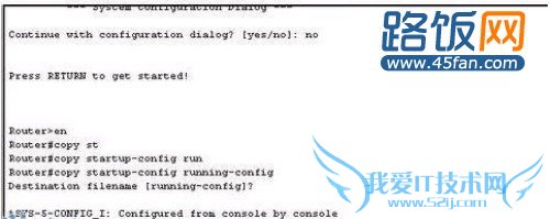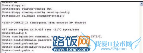 4、重启之后路由器已经跳过了startup-config配置文件,然后保存startup-config文件到running-config即当前配置。命令是:Router#copy startup-config running-config