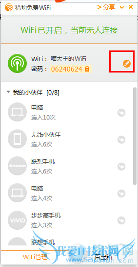 答:猎豹修改设置方法密码如下: 1.启动猎豹免费wifi后,在桌面右下角会看到猎豹免费wifi的图标,点击就可以打开猎豹免费wifi的快捷窗口了。 2.在打开的快捷面板中,会看到一个笔状的图标,这个图标就是编辑按钮,点击可以修改猎豹免费wifi的网络名... >>详细