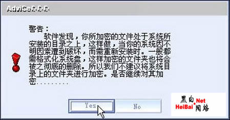 随后弹出一个加密提示窗口(如图2)。在此单击“Yes”按钮,弹出一个“重要警告”窗口,在此提示我们,如果给系统盘加密时,格式化分区前要对该分区加密文件进行备份,否则数据丢失。确定后,弹出一个加密窗口(如图3)。