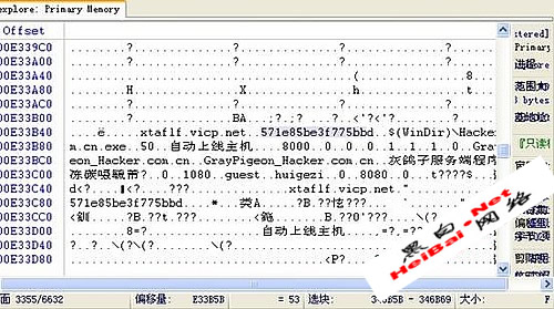 首先我就在本机配置一个鸽子的服务端,域名用xtaflf.vicp.net,连接密码为0348088,然后在本地运行,因为在鸽子主程序生成服务端的时候,密码就已经加密成一个16位的MD5变位的密文配置到服务端里面,用网上下载来的MD5破解软件是破解不出来(因为是变位的MD5加密),所以在服务端里是找不出明文密码的,但是我们可以把加密后的密码找出来吧,好,我们打开“WinHex”点击“打开RAM”,找到 “iexplore.exe”选择主要内存,再点击“搜索文本”输入域名:xtaflf.vicp.net,点击确定,按F3直到这里,如图1