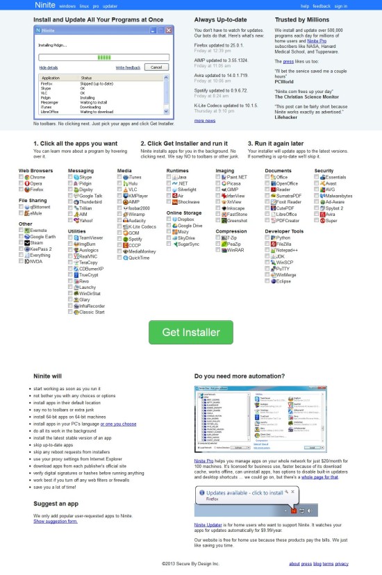 最近从同事那里知道的这个 Ninite 网站,虽然中国已经有很多这样类似的软件了,比如360安全卫士,里边自带软件宝库。不过给老外装软件还装360。有点不切实际,所以这个网站对于我来说就很实用了。