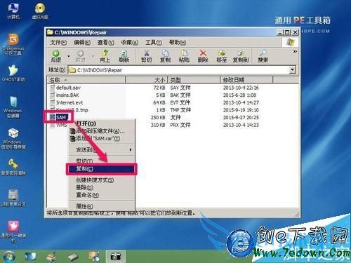 4、找到一个SAM文件,没有后缀名,这个是系统备份的管理员登录配置文件,里面有登录的信息,重要文件,如果是精简的XP系统,可能没有这个文件,就只能重做系统了,如果有这个文件,右键“复制”。