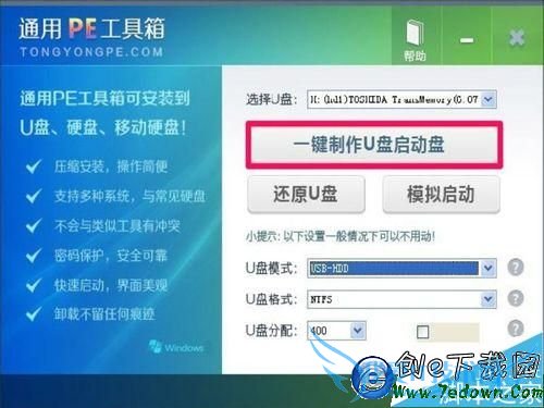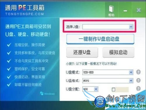 2、安装完成后,启动这个软件,在主程序界面,先选择U盘,如果没有插上,这时就可以插上了,就会显示在“选择U盘”框中。