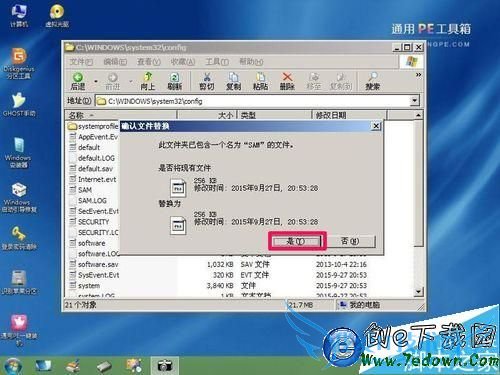 7、因为这个文件夹本来有个SAM文件,当粘贴时,会弹出提示,是否将现有的文件替换,按“是”即可,之所出现不能进入系统,就是因为这个文件损坏而引起的,所以必须替换它。然后退出PE,重启动电脑,就可以进入系统了。