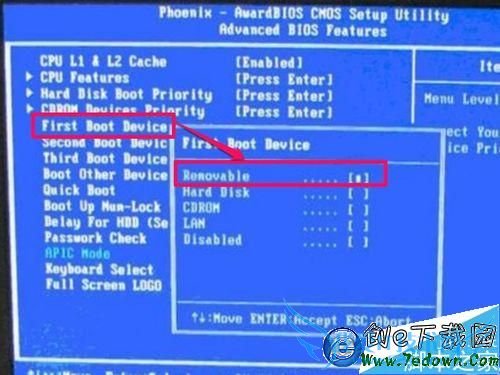 5、然后按ESC返回到Advanced BIOS Features窗口,再选择First Boot Device这一项,按Enter,进入小窗口,选择Removable,即移动盘,或USB-HDD这样的项,按Enter回车。最后按F10保存并退出,U盘启动就设置好了。