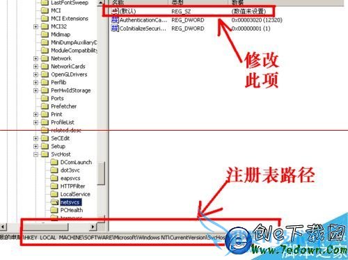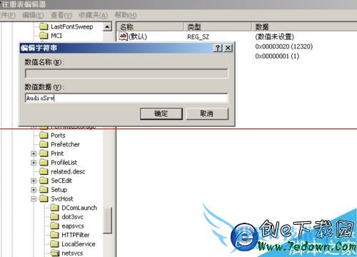 4、在打开的“注册表编辑器”中依次打开HKEY_LOCAL_MACHINE\Software\Microsoft\ WindowsNT\CurrentVersion\Svchost\netsvcs,在默认项中双击,在打开的数据数值里输入“AudioSrv”后按确定。