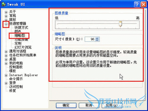 1.用tweak ui将缩略图改小以后加快缩略图显示的效果非常明显,特别是对于存放大量高质量图像文件的文件夹来说效果更为明显。对于缩略图图像质量的更改仅对新生成的缩略图有效,而对以前生成的缩略图文件不能产生更改,所以建议更改之后将机器上所有的thumbs.db文件删除,这样再次打开文件夹时,就会按新的设置生成缩略图了。