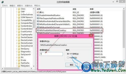 3、将其中的 NtfsDisable8dot3NameCreation这一项的值设为 1,1代表不创建短文件名格式