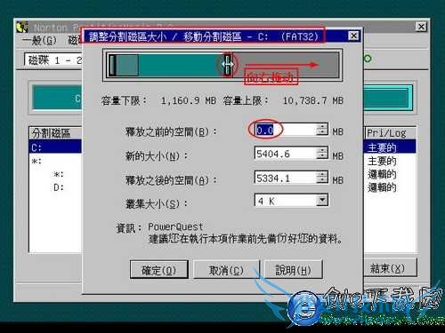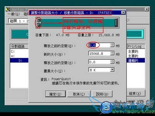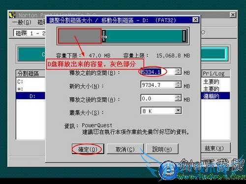 这里一定要释放D盘头部的空间,因为C盘和D盘是相连的,这样释放出来的空间就可以直接分配给C盘。如果是释放D盘的尾部空间,因C盘尾部与D盘尾部不相连而导致释放出来的空间无法分配给C盘。这一点尤为重要。这一部操作完之后,点击“确定”按钮来保存刚才的操作。