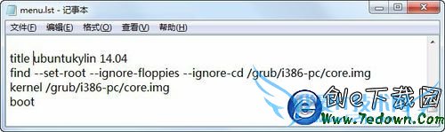 4、修改menu.lst,添加加载Ubuntu的菜单。添加的菜单可能如下所示: