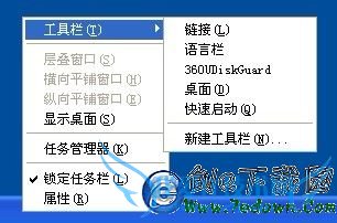 8、修复完后我们需要开启“快速启动栏”和“语言栏”的显示状态,只需在右击任务栏空白处,弹出的菜单指向“工具栏”,将子菜单中的“语言栏”和“快速启动栏”勾上即可
