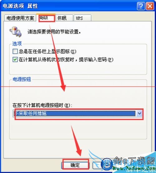 5、“在按下计算机电源按钮时:”选项,选择“不采取任何措施”,然后点击“确定”,这样就完成了我们所要希望达到的设置。