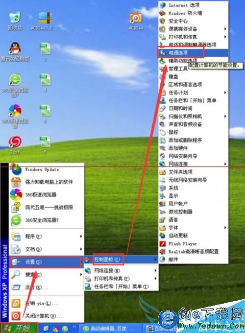 2、菜单方式:依次点击菜单“开始菜单”——“设置”——“控制面板”——“电源选项”,就可以打开“电源选项”窗口。