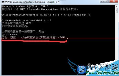 4、点击回车,会发现此时磁盘被占用无法检查,提示我们是否下次开机检查,输入n,点击回车