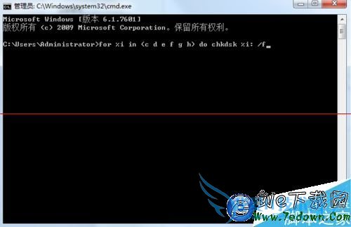 3、进入命令行界面,输入【for %i in (c d e f g h) do chkdsk %i: /f】命令,点击回车