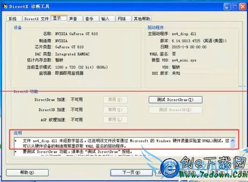 出现这种情况原因并非弹窗中说的显卡驱动太旧,而是显卡驱动“太新”。由于微软已停止维护XP系统的缘故,NVIDIA官方也不再对XP系统下的显卡驱动进行WHQL的签名认证。因此,当XP系统安装了太新的显卡驱动后,会由于显卡驱动中的文件没有数字签名从而导致DirectX功能无法正常使用。从DirectX诊断工具的“说明”中能够看到具体原因(如下图)。知道原因后,只需要将原驱动卸载安装英伟达之前版本的驱动即可。