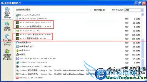 2、在“控制面板”中的“添加或删除程序”里卸载掉NVIDIA显卡驱动以及所有组件(如下图),并根据提示重启计算机。